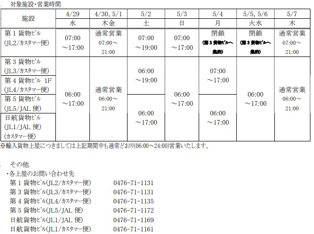 【JALCARGO】ゴールデンウィークの輸出上屋営業時間のご案内